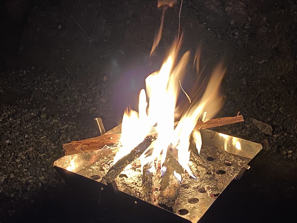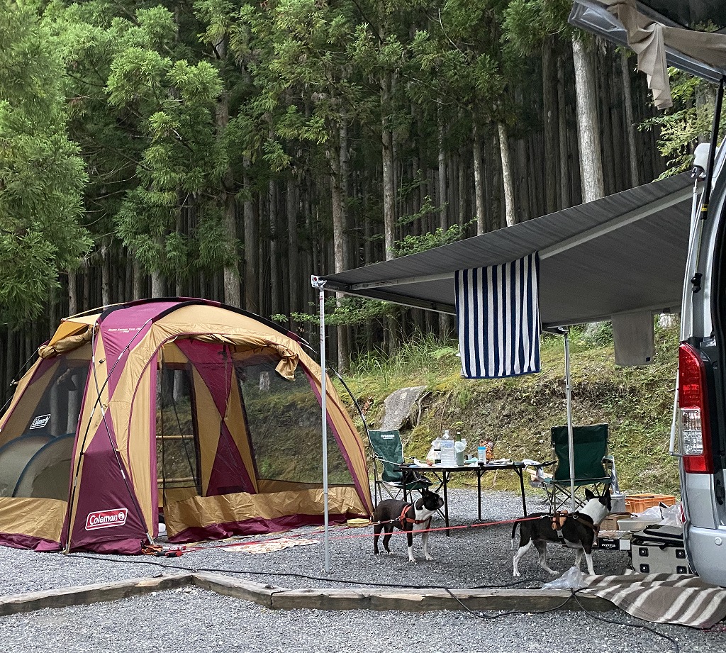 キャンプ場は川沿いの斜面を整地した場所で、サイトに行くにはかなり急こう配を登る。