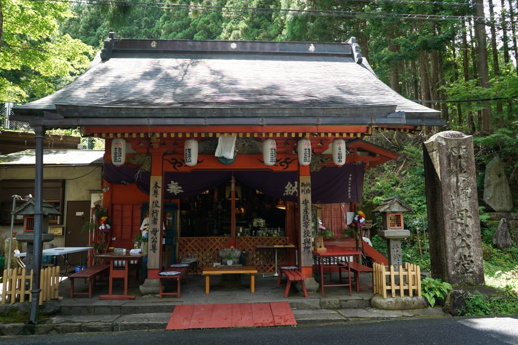 入り口には、修行中の行者様を心配した母親暮らした庵が「母公堂」として残っている。