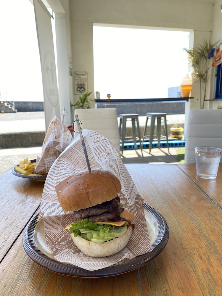 キャンプ場の下見に行って、近くのハンバーガーショップで昼飯。白崎海洋公園にも立ち寄ったけど、白い不思議な岩場は思ったより広かった。