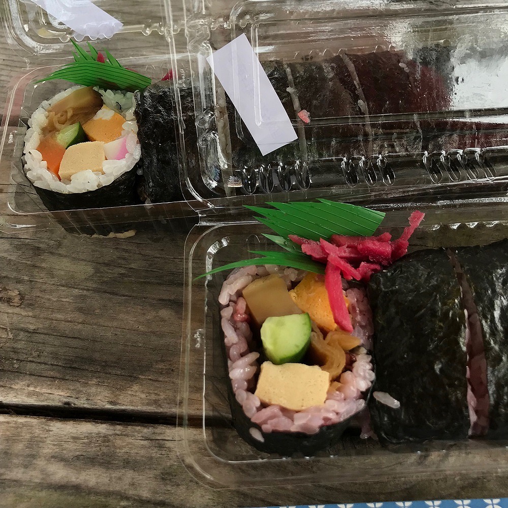 最近話題の「巻きずし街道」で巻きずし2種類を購入して、日本のへそ公園で、おいしくいただきました。