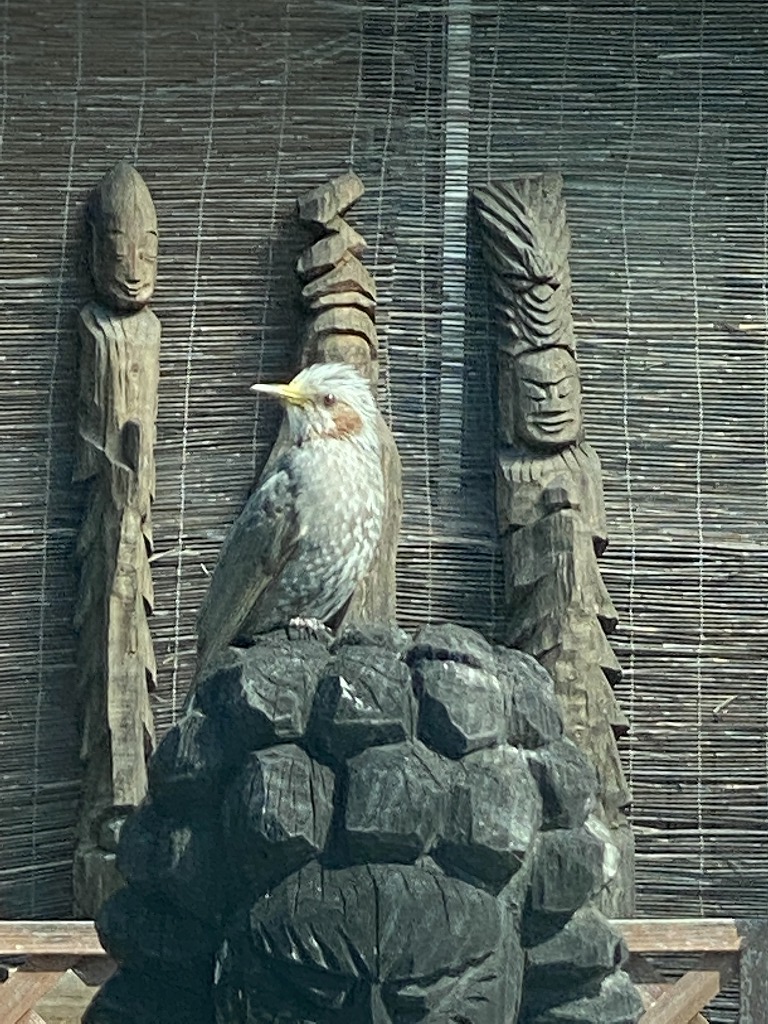 前の広場に、いっぱいの円空仏が並んでいて、、、不動明王?の頭に鳥が1羽