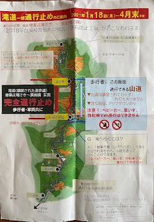 ちなみに、この日(1/18)から4月末まで滝道の一部が通行止めで、川の反対側にある少々きつめの坂や階段がある道を通らなければならないと書いてありました。で、行きは山道を歩いたのですが、なぜか初日は工事をしていないことが分かり、帰りは普段通りに滝道を帰りました。