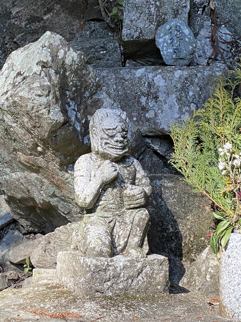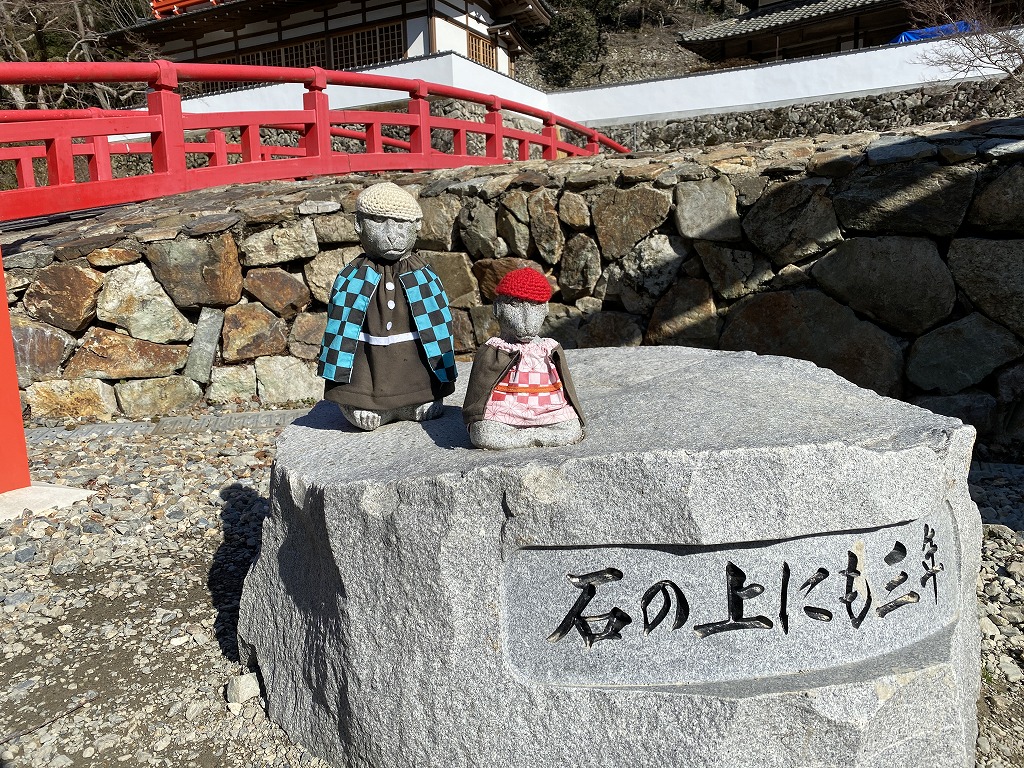 箕面駅から滝までの真ん中辺りにある「瀧安寺」。石の猿が鬼滅のはっぴを着てました。
